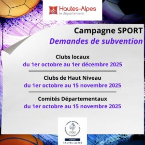 📢 Campagne de subventions sportives 2025-2026 Le Département des Hautes-Alpes lance sa campagne annuelle de subventions pour accompagner les clubs et comités sportifs dans leur